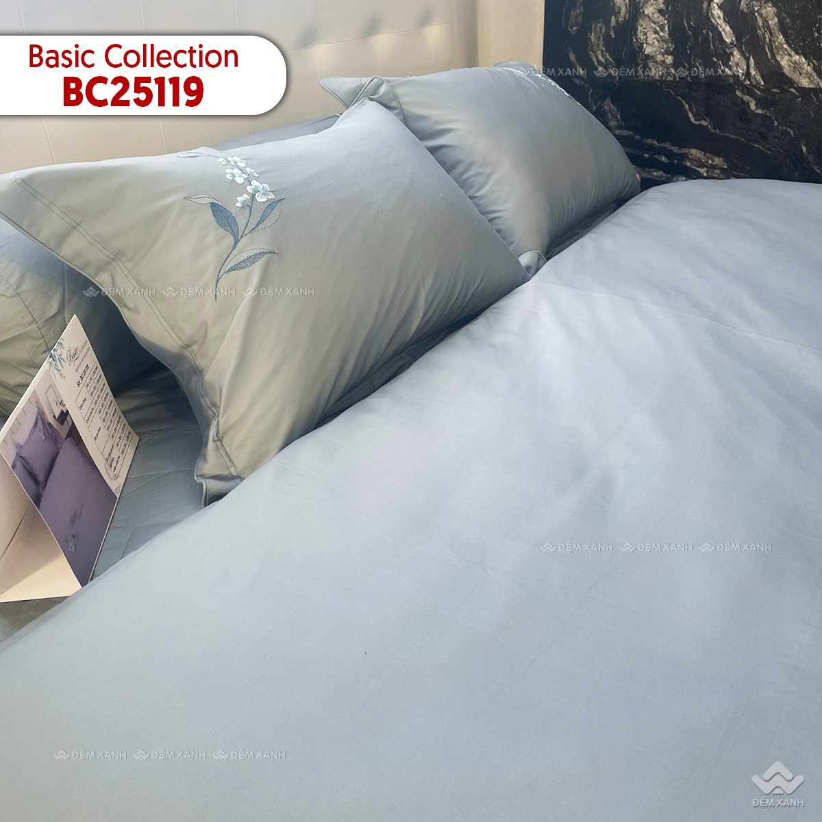 Bộ chăn ga gối BC25119 gây ấn tượng mạnh với phong cách thiết kế tối giản, sử dụng tông màu xám khói thời thượng làm chủ đạo. Gam màu trung tính này không chỉ mang lại sự thanh lịch, sạch sẽ mà còn cực kỳ dễ dàng phối hợp với các món đồ nội thất khác. Điểm nhấn nghệ thuật nằm ở họa tiết thêu nhành hoa tinh xảo, nhẹ nhàng, tạo nên một chiều sâu thị giác đầy lôi cuốn. Đặc biệt, dòng chữ “Basic Collection” được thêu mềm mại, uyển chuyển trên bề mặt vải, giúp nâng tầm không gian sống và mang lại cảm giác thư thái cho người sử dụng.