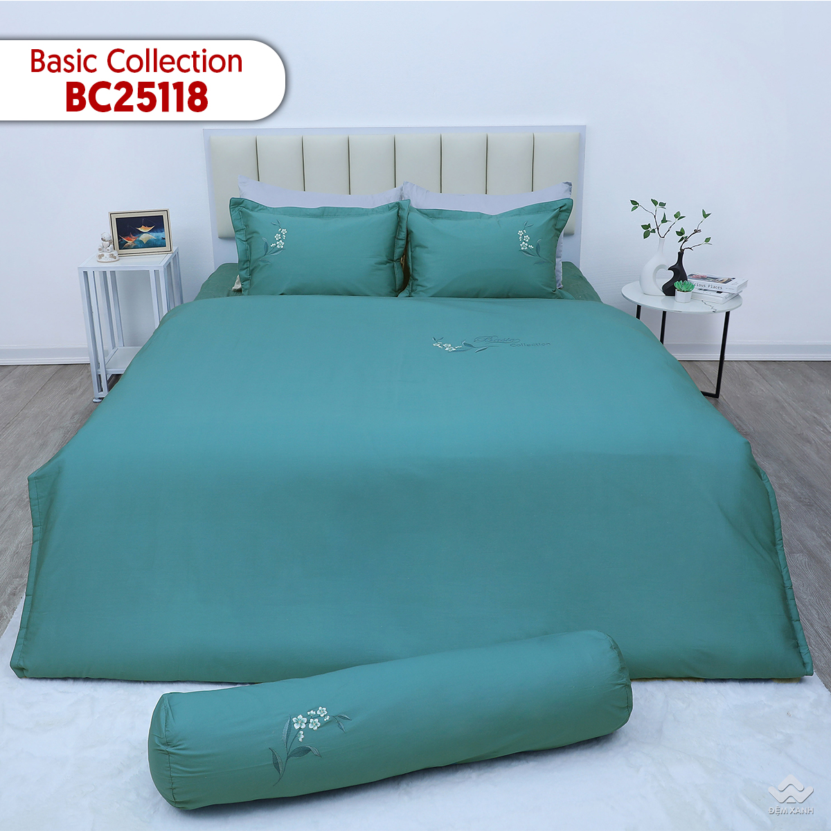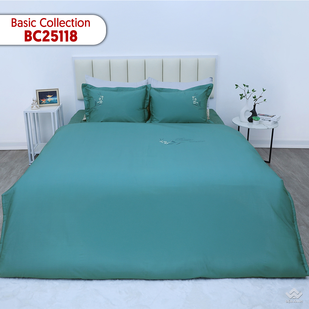 Bộ chăn ga gối BC25118 ghi điểm với thiết kế hiện đại, sang trọng nhưng vẫn giữ được vẻ dịu dàng, tinh tế. Nền xanh ngọc trầm lắng mang đến cảm giác thư giãn, mát mắt, dễ dàng hòa hợp với nhiều phong cách nội thất. Điểm nhấn đặc biệt chính là nhành hoa nhỏ và dòng chữ Basic Collection cách điệu được thêu nổi đầy tinh xảo – từng đường kim mũi chỉ mềm mại, uyển chuyển như vẽ nên một góc thiên nhiên yên bình trên nền vải.